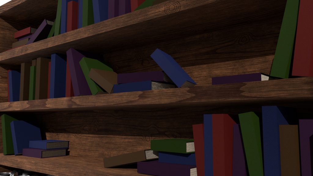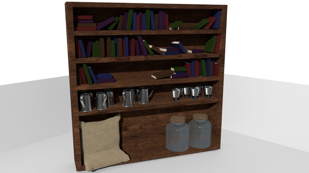 The bookcase is found in the back corner next to the bar. It is a space to hold both bar supplies and books. It holds a folded burlap sack, two oversized jars, goblets, flagons, and many books in 5 sizes and 5 colours – resulting in 25 individually made textures. Unfortunately, the leather texture on the book doesn’t show up very well in the pictures, however, the paper on the sides is something I’m proud of.