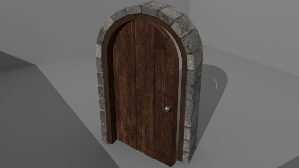 The door is made of marbled stone bricks surrounding a wooden frame and a wooden door, the planks are individually modelled in the same way as the floor and tabletops. The doorknob is iron although I understand that in a medieval scenario this may not have been historically accurate, this is a fantasy setting therefore I am choosing to disregard that. In the video the door appears closed, but I have modeled it open for these shots.