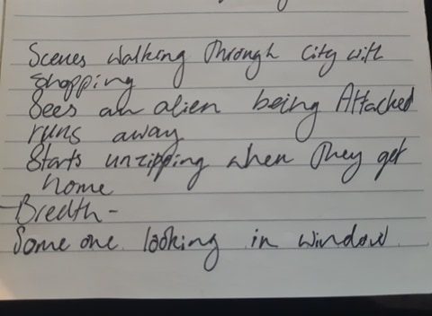 Mid-Close up of Main Character’s feet as he walks down a street at the far side of a road, through the moving background you see an alien burst from a building, a female screams. Main Character comes to a standstill and feet turn to face the scene as police come in through the left and gunshots are fired, bringing the alien to fall. Rest for 3 seconds as the alien bleeds out. Main character turns and begins walking again.Â