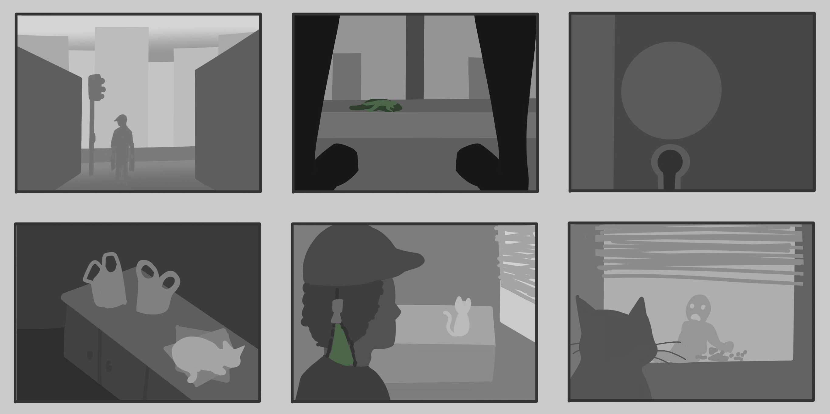A quick cut to a mid-shot from the same angle but now showing the whole upper body of the main character turning to the window. This would also be done pose to pose. The cat would also turn and be startled.