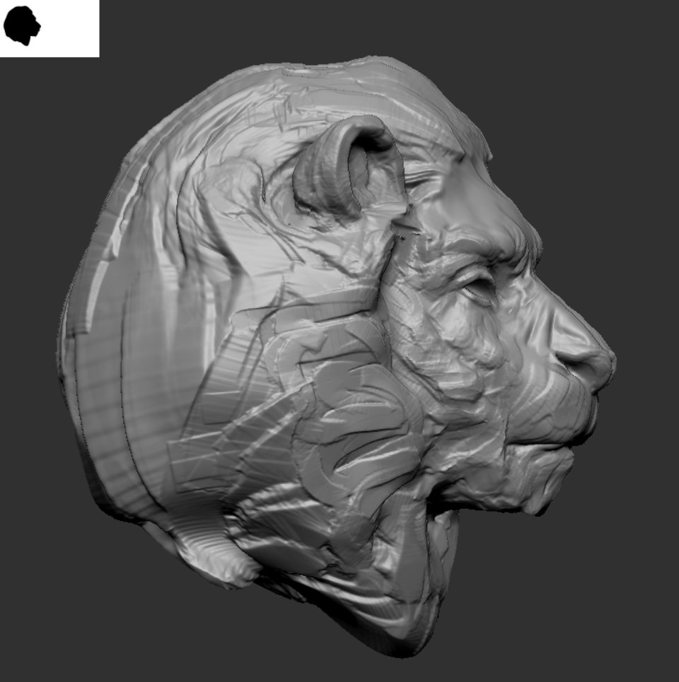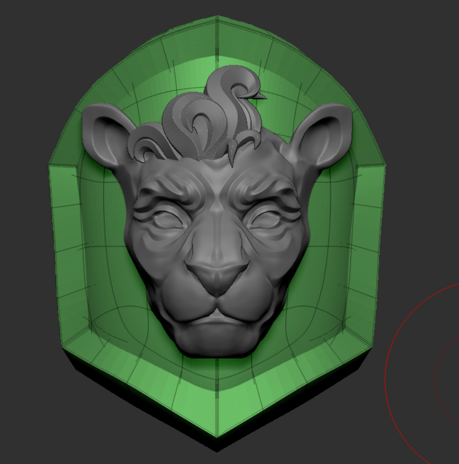 The Lion’s face was created from an initial Dynamesh sculpt and then Zremeshed. Next, I used the pinch brush and the Mech Cut brush to create the hard stylised lines. Finally, I polished the flat surfaces to give them a cast hard metal look.