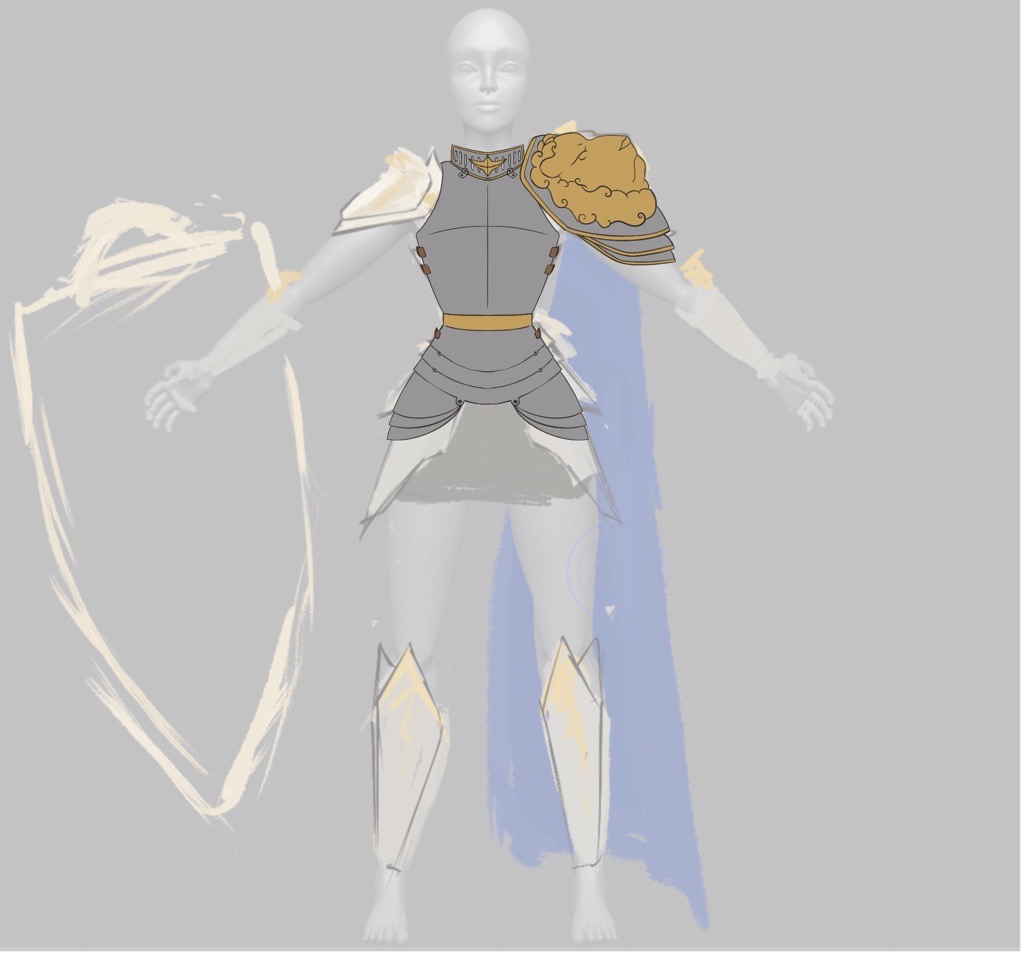Across my time on this project, I created various unfinished pieces of concept art. I did not intend to complete these images, but rather, I produced them to explore ideas without modelling. Doing this helped me to settle on a design for the chest piece and leg armour. It also helped me to decide on the shape of the pauldron.