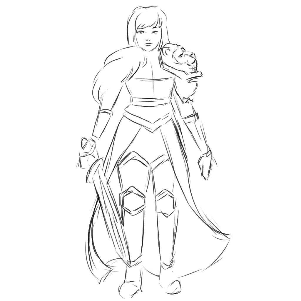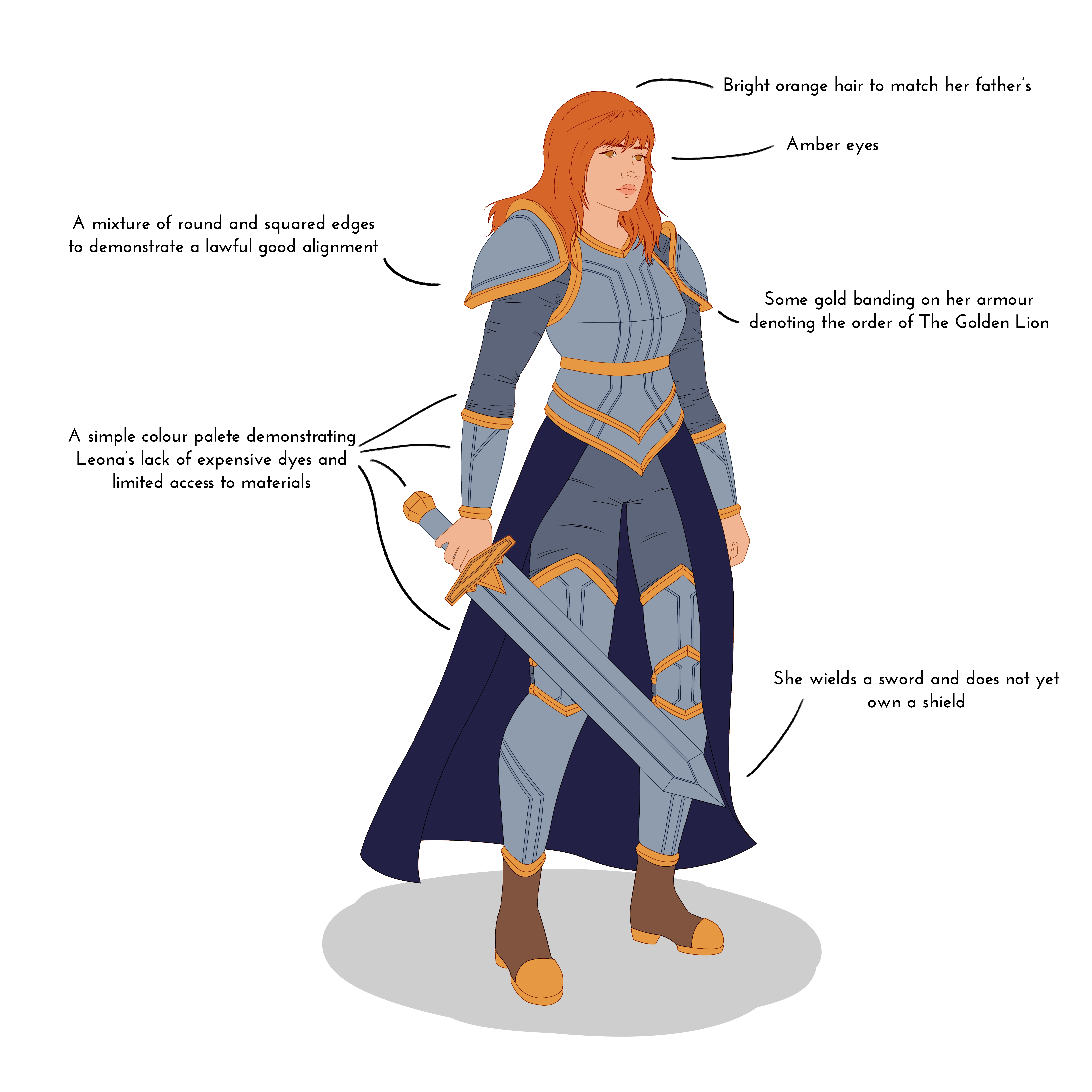 Leona’s armour will be the same as my original design and will utilise simple rounded shapes. In shape theory for character design, round shapes with some squared edges denote a lawful good character – this will help to set the viewer’s expectations of the character.