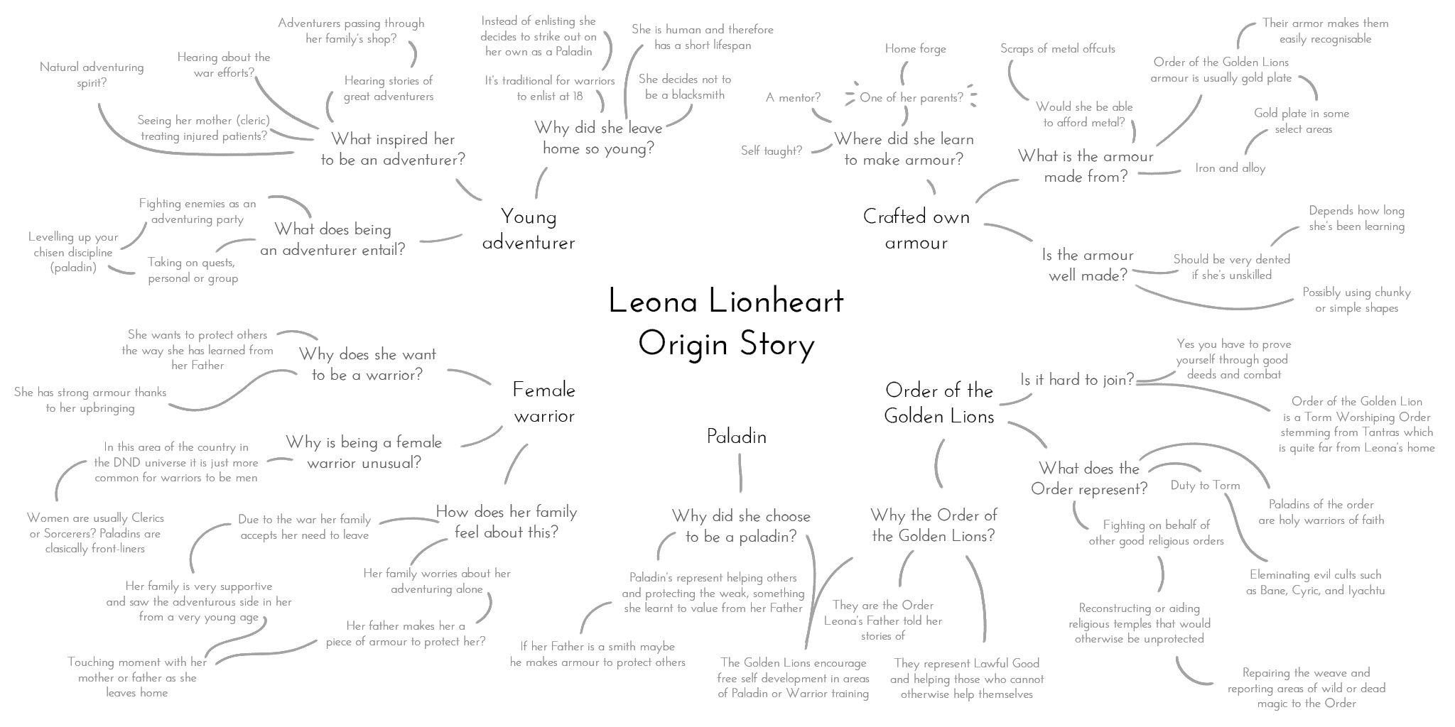 I had a few set character elements that I worked with to develop her backstory: She crafted her own armour, she’s a young adventurer, she was born in an area where it’s more common for men to be warriors, and she is a paladin hoping to join the paladin order of The Golden Lions. I created a mind map with these elements in mind to prompt further thought about her character backstory.